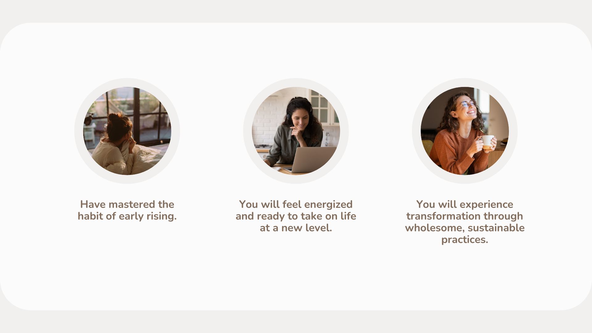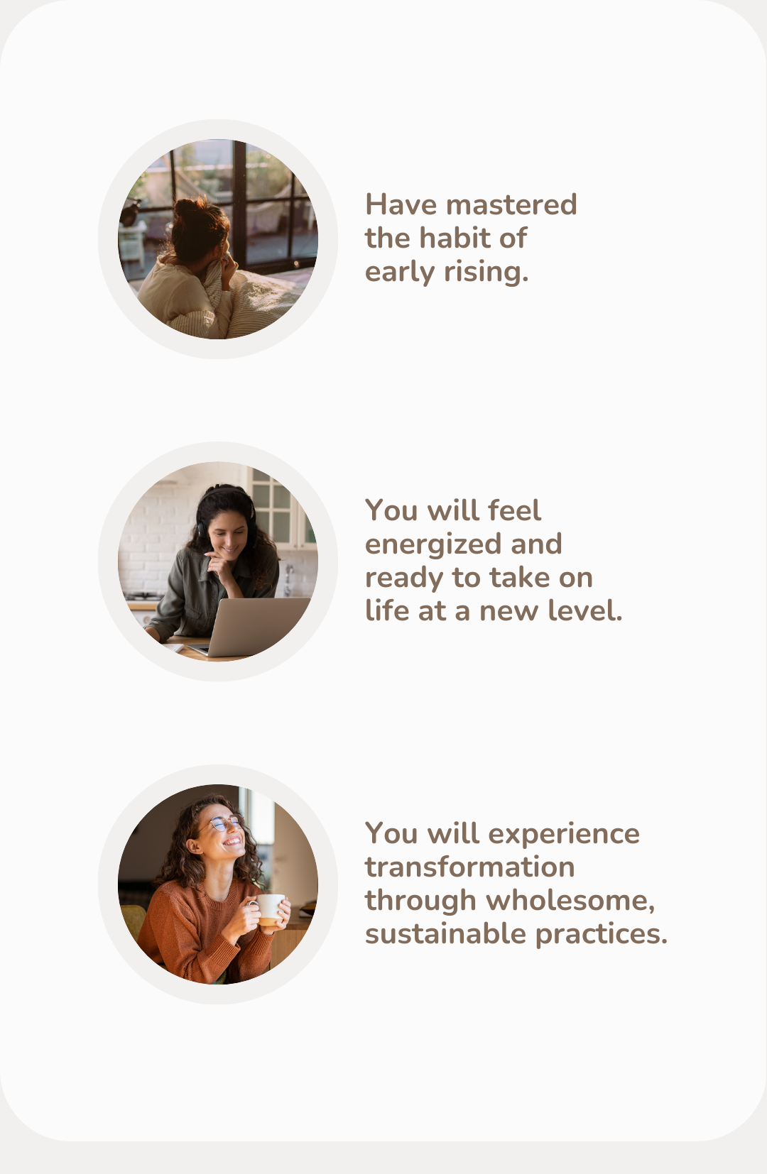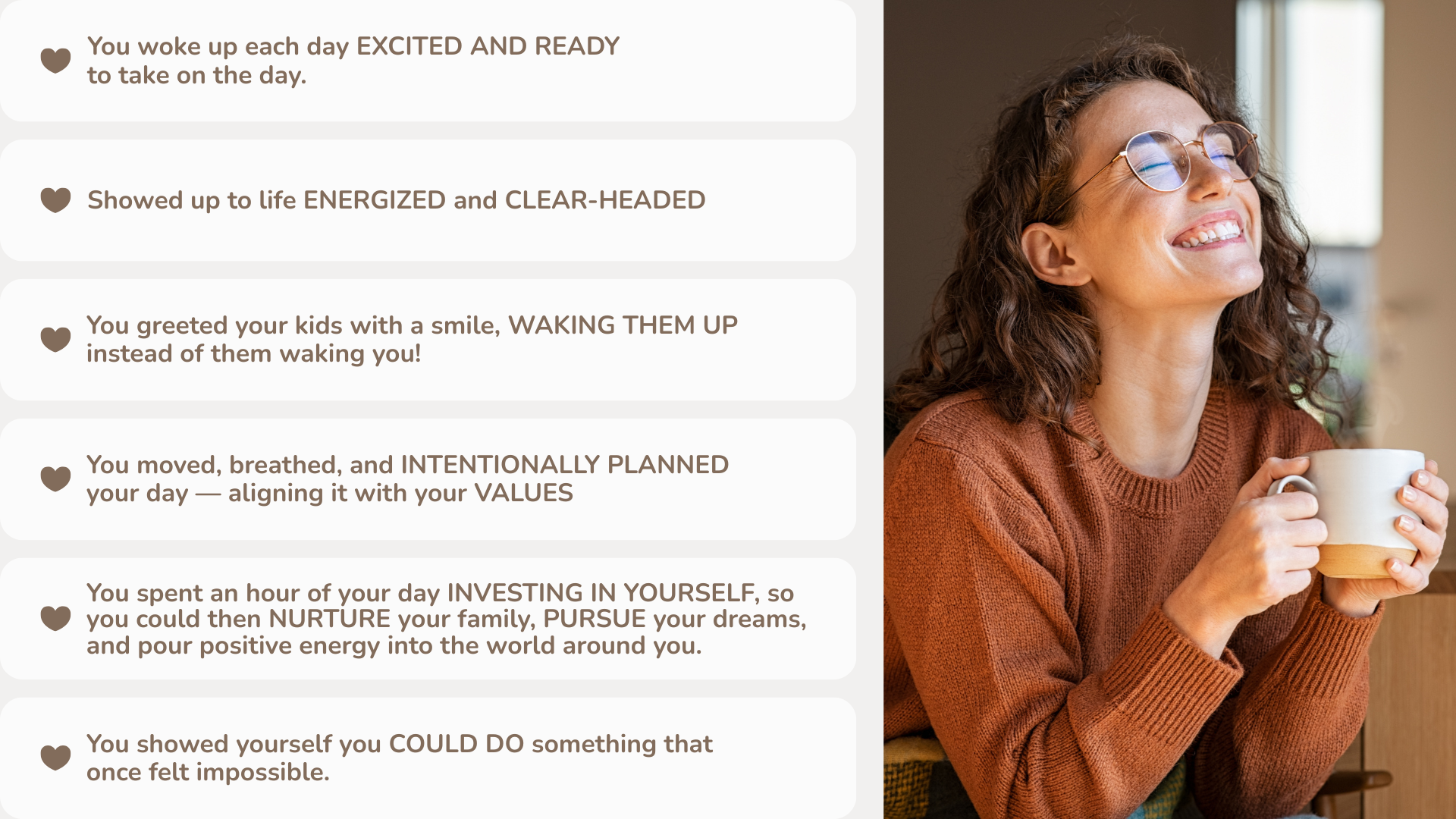 You’re definitely not alone — most women who join this program start out feeling the same way! The beautiful part is how quickly that can shift when you’re surrounded by structure, encouragement, and a group doing it together. You’ll gently train your body and mind to wake up feeling more clear, energized, and ready for the day — even if mornings have always felt hard.