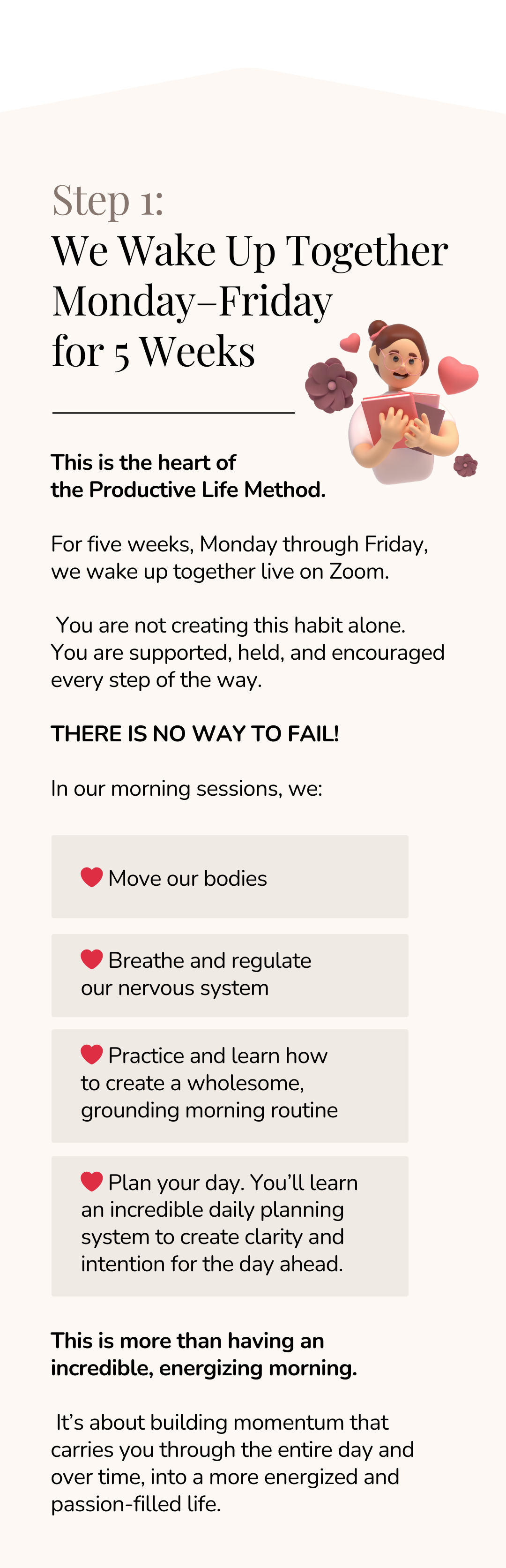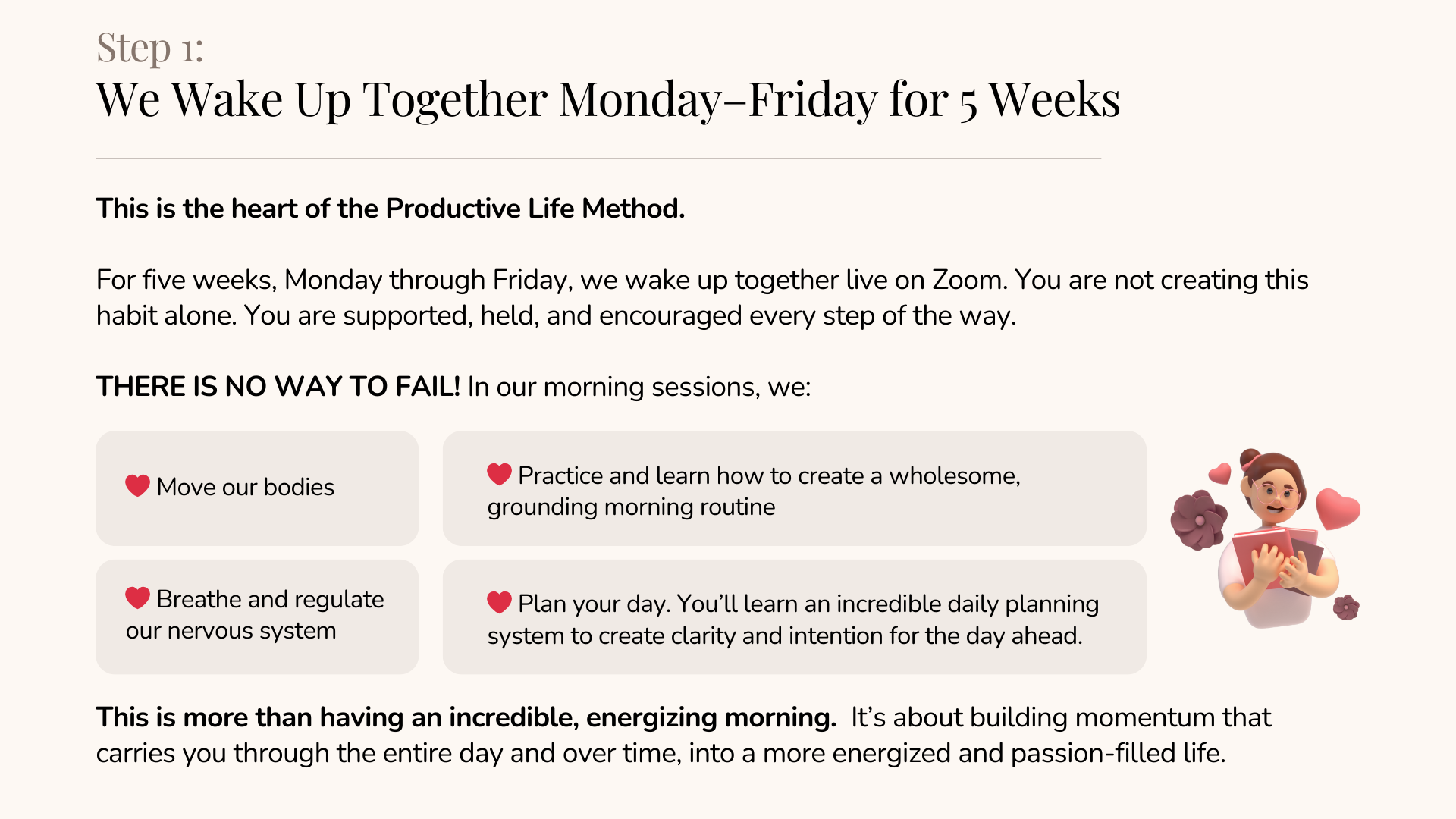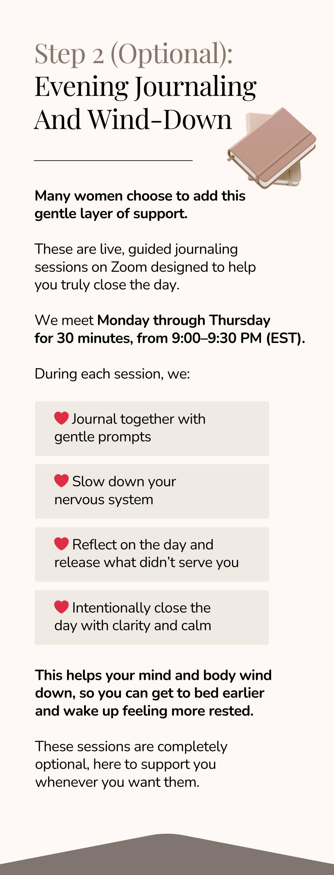 You’re definitely not alone — most women who join this program start out feeling the same way! The beautiful part is how quickly that can shift when you’re surrounded by structure, encouragement, and a group doing it together. You’ll gently train your body and mind to wake up feeling more clear, energized, and ready for the day — even if mornings have always felt hard.