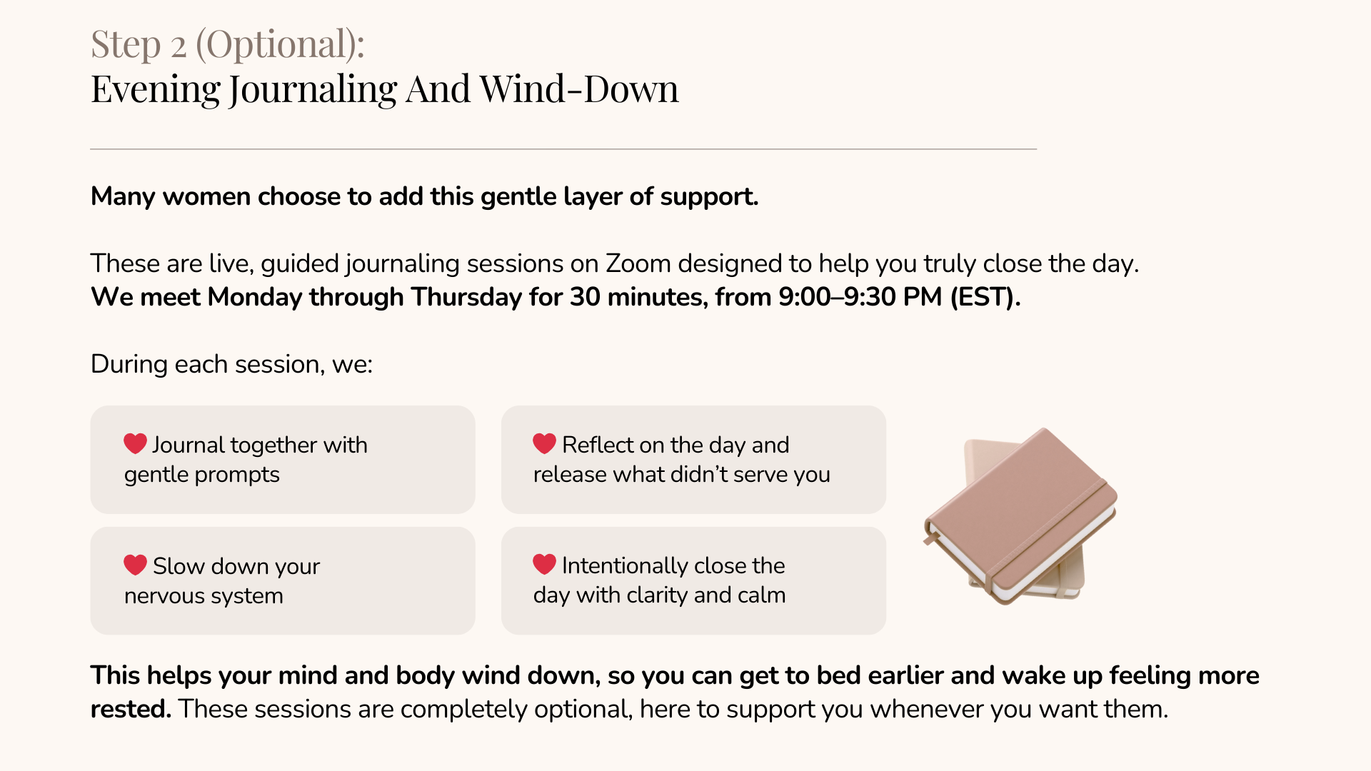 Each morning session runs for about 60 minutes, and there’s an optional 30-minute live evening reflection to help you unwind and close your day intentionally.