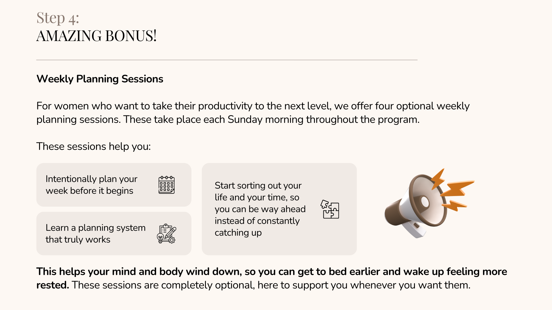 Optional weekly sessions to plan your week with intention and learn a system that truly works.